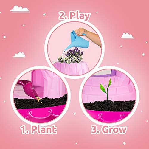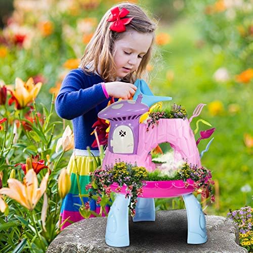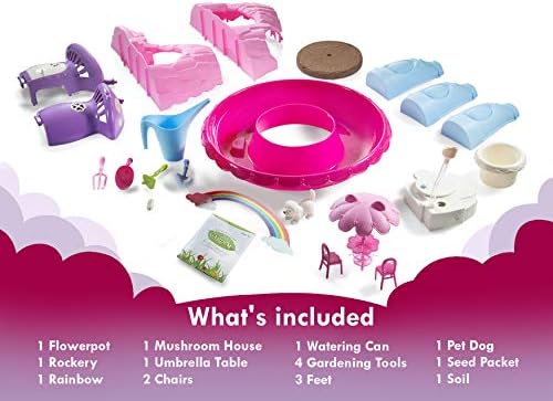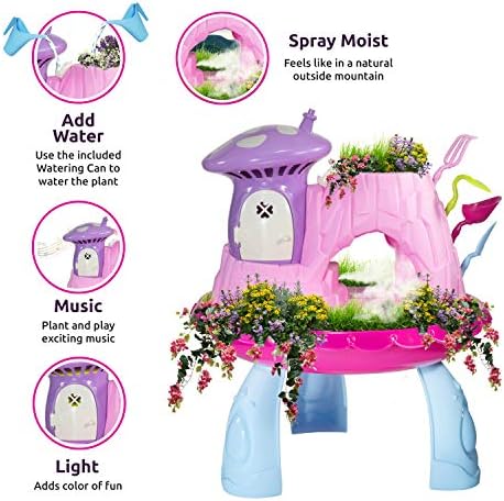 My Fairy garden magical cottage plant and grow your own magic garden use the included soil and seeds to grow a real garden on top and along the bottom! reusable nature cottage garden toy for continuous growing fun. Outdoor and indoor garden kit Kids gardening tools set includes all fairy garden accessories shovel, trowel, garden toy rake, water can, pink flower pot, mushroom house, rockery, fairy house kit features dog pet, rainbow, umbrella table, 2 pink chairs, 1 packet of 5 magical seed mix, 1 soil ,using the garden tools children will be able to grow their very own fairy garden, you can even decorate with some pebbles, stones, garden toys, or other fun things you have and play in the fairy world you create! Great kids outside toys. Kids crafts stem toys develops important learning STEM skills. Children will learn and love to grow plants and watch their very own little garden carefully grow, kids gardening sets gives them a connection to nature and a sense of satisfaction at having nurtured a living thing. Just check your garden every day and watch as the seeds develop into mature plants, make sure it gets the right amount of water and sunlight too. science kits for kids and toddlers Garden decor relax at the fairy garden house with a cool pieceful stream of mist along with beautiful music and glittering garden light in the fairy house charming details includes pink umbrella table with 2 pink chairs, dog pet, rainbow Gardening gifts a green and playful fun activity fairy garden kit for all agesĀ 4 years old and up. Kids plant growing kit instruction included.