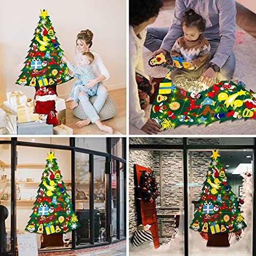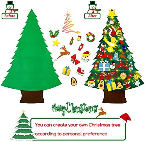 šćHigh-Quality Felt TreećThe material of felt Christmas tree is excellent and environment friendly. The felt is not easy to be damaged, sewing of sticker is firm and not easy to fall off. The felt Christmas tree and pendants are not fading, stain-resistant, and can be reused. šćEasy to Useć With hanging rope, you can easily hang it on door or wall, and all of the ornaments are easily attach to the felt xmas tree. Kid can attach it as their mind. which is not only the best Christmas decoration to your house, but also the great toy for kids to kill time. šćRich in Categoriesć Our DIY toddlers felt Christmas tree set is rich in categories, includes 16ft string lightsļ¼Needs 3 AA Battery, Not Inclued) and 36 pcs ornaments that include Christmas symbol pattern, such as Santa, Christmas socks, Christmas moose, snowman, snowflake, candy etc. No pollution, environmental friendly, totally safe for kids. šćCultivate Manipulating Ability &Enjoy Parent-Child TimećThe felt Christmas tree is child-friendly, safe, odorless, and soft and comfortable. The felt Christmas tree with ornaments is suitable for children to develop their hands, vocabulary, hand eye coordination, fine motor skill & color recognition, and suitable for the family to enjoy parent-child time. šćBest Christmas Gifts for Kidsć New designed felt Christmas tree for toddlers updated from old edition are more popular and novelty among kids with 36 pcs ornaments. This DIY felt Xmas tree will be the perfect Christmas gift for your little toddler.