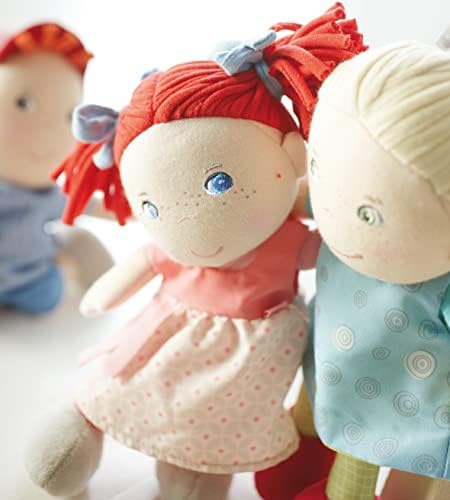 Like All HABA soft dolls, Mirli is machine washable on cold. At just 8″ tall, she is the perfect size for babies ages 6 months and up! Mirli has an embroidered face with blue eyes, freckles and an impish smile. Her soft body has a bean bag bottom giving it a slightly weighted feel and allowing her to sit properly. Mirli’s bright red hair is made of woven cotton with a stretchy feel and styled in two bunches with bows. Please note the color of hair bow varies and may be blue or yellow. Her dress closes in the back with hook and loop fastener and is easy for little hands to take on and off. Her shoes are sewn on and she comes packaged in her own beautifully designed tin. Mirli is an ideal new baby, 1st birthday or Christening gift. Mirli makes a great compliment to other HABA 8″ soft dolls Mirle, Miro, Felicia and Felix (all sold separately). She’s can also be an incredibly sweet little sibling to our larger 12-15″ soft dolls.