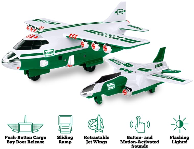 The Hess Truck’s back and its better – and bigger – than ever! The 2021 Hess Cargo Plane and Jet has landed in the fleet, all geared up for high flying adventure with 6 remarkably lifelike, button and motion activated flying sounds, and enough LED bulbs to light up the night sky! The Cargo Plane is an impressive, six turbine engine, heavy-load transport aircraft. Colored in white with a green undercarriage, bold green striping, sparkling chrome nose cone and accents, the plane includes free-rolling, foldable landing gear, and 32 high-visibility lights that provide an impressive glow. A quick press of the taillight will release the rear cargo bay doors to provide access to the Jet. A hidden slide out ramp makes loading and unloading the expansive, internally illuminated cargo bay a breeze. With a nearly 14-inch-long fuselage and 15-inch wingspan, the Cargo Plane is the largest Hess vehicle ever! The accompanying Jet completes this formidable flying duo. Designed for speed and aerodynamic maneuverability, the sleek Jet roars to action with a combination of button and motion activated sounds! 3 top-mounted buttons will flash the engine lights and activate realistic takeoff, flyby, and landing sounds. Tilting the Jet activates the Climb/Dive, Bank, and Cruise motion sounds. The strikingly bold white and green colors are enhanced with finely detailed inlays and chrome nose cone and accents. The Jet also has free-rolling, folding landing gear and 2 sets of spring-loaded retractable wings which allow it to travel covertly inside its Cargo Plane partner or fly solo missions.