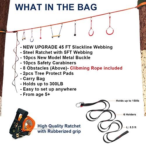NINJA WARRIOR FUN & BENEFIT★ Our ninja warrior training equipment kit is one new slackline monkey bars playground equipment for core strength training, agility, focus, balance exercise. Enjoy it with your kids, family, friends and love ones for everyday endless fun & exercise for stronger NINJA OBSTACLE COURSE LINE KIT WITH CLIMBING ROPE DESIGN★ Including 1* 45ft ninja slackline, 1* 3.0 updated ratchet with 5 ft slackline (total 50ft),1* Climbing rope ladder 2* thicken swing monkey bars , 2* ninja fists 3* ninja rings, 2* tree pads, 1* carry bag, 10* safety carabiners, 10 adjustable metal buckles that for DIY your exclusive ninja obstacle course kit with other accessories EASY TO USE★ With instruction manual & strong ninja slackline & 3.0 ergonomic protect wrap ratchet, Our Adjustable Ninja Obstacle Course Kit is quick and easy to set up. Meanwhile, It’s good to use as a Traditional Slackline Kit as well for balance training & fun, also could set it up in play room and use outdoors when camp or backyard ANYWHERE USE★ Just need 2 strong tree or sturdy post or hanging hook. Play it on your backyard, playground, outdoors, indoor, home gym, pool, fitness class, party, camping trip, beach, park and anywhere, enjoy endless entertainment with Our Kids Ninja Warrior Training Equipment BUY WITH CONFIDENCE★ Ages 5+, max weight 300 lbs; Adult supervision required. Your satisfaction is our top priority. If you have any questions, please contact us in time, we ensure the quality of every item personally. Enjoy your Ninja Training Obstacle Course Kit, order now!