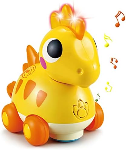 ♫【Teach Baby to Crawl】 When press the back of the dinosaur, it will walk around, nod heads and play several songs with LED light! Your baby will pay more attention to the cute baby dinosaur toys and follow it. Crawling can develop baby’s gross motor skills. Excellent choice for 6-12 months baby. ♫【Learning Educational Fun】 Both of you and your babies can play with dinosaur toy. Pressing the button and it will move with funny songs, which can develop babies and toddlers with a musical mode. Babies also have fun when they are encouraged to crawl following the toy. ♫【Music & Light】This brightly adorned yellow dinosaur toy lights up and play variety of songs. Sound effect Imitating baby dinosaur calls make more fun on baby. The LED light is soft and safe, it will be helpful to baby’s visual development. Volume adjustment button is used to avoid problem about too low volume and too high volume. ♫【Go & Stop Modes】Turn on “GO” mode, it is easier to press the button and go around with the self-avoids obstacles function which can guide babies in a safe direction. Switch to “STOP”mode and it will be a cute dinosaur toy with sound and light effects too, which can develop baby’s aesthetic sense and hand-eye coordination. ♫【Safe Materials & Guarantee】The dinosaur toys is made of non-toxic ABS, polished smooth edges, burr-free and contains no small parts to ensure baby’s safety. You don’t worry about something will be put into baby’s mouth when playing. If there is any problem, please inform us and we will make a satisfactory reply for you.