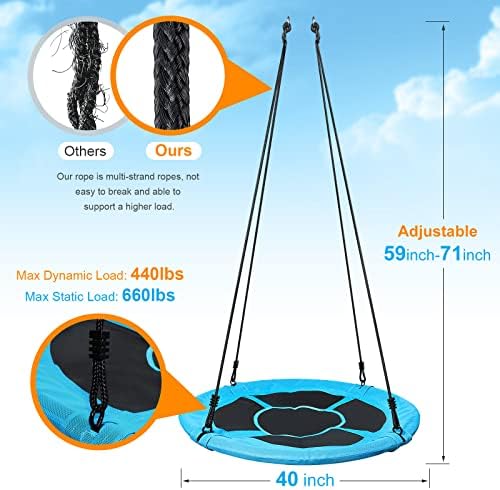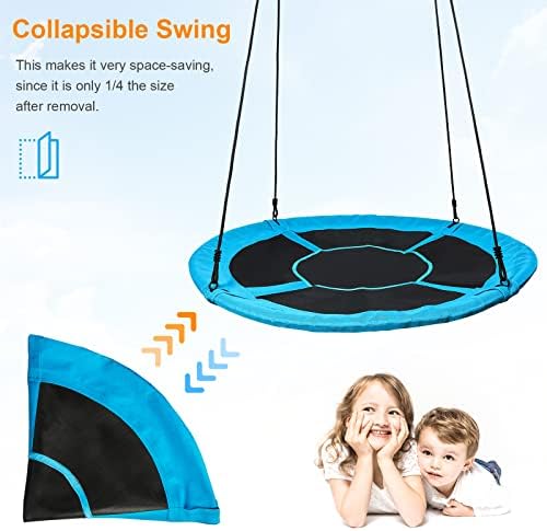 ANTI-FADE TEXTELINE: Unlike other swing made of cheap fabric, our 40’’ saucer swing (Upgrade Version) is made of Anti-Fade Texteline. Wikipedia said, “Texteline are high strength polyesters with PVC compound. They are often used in outdoor and garden furnitures due to UV resistance, comfort and ease of cleaning.” Thanks to this high quality Texteline, our swing is safer and more durable. JUST HAVE FUN TOGETHER: ASTM F963-11 approved. With a load rating of 440lb, this 40’’ tree swing is able to fit 2-4 kids or adults, promoting teamwork and social skills. Do NOT have to take turns waiting for each other to get off. Just all get on at once! Recommended for children 3+ years. COMFORTABLE SITTING AREA: Sitting area is a whole piece. No holes, which increases the safety especially with small children, since these can not get stuck. In addition, toys can also be carried on the seat without falling out. Soft foam padding outside steel frame, prevents children from getting hurt while playing. ADJUSTABLE LENGTH: Length of ropes can be adjusted from 59-71inches(150-180cm). The minimum ground clearance is 13.8inches(35cm). If you hang it on a frame, the distance from the frame must be at least 18inches(45cm). Installation instructions: A distance of 78 inches (2 meters) around the nest swing is recommended. This tree swing can be used in many places, you can attach it to swing sets, jungle gym, playground equipment, or treehouse. EASY TO USE & STORE: Easy mounting, can be hung up and used directly. The swing is collapsible, easy to disassemble and store. This makes it very space-saving, since it is only 1/4 the size after removal. Our easy to follow instructions make it a breeze to put together or take apart.