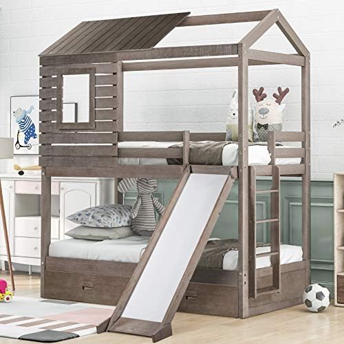 [Twin over Twin Bunk Beds] Crafted with a whimsical playhouse design while maintaining a tasteful natural appeal using a neutral color scheme, this bunk bed offers kids a comfortable and exhilarating experience during both sleep and playtime that will let their imaginations run wild. Perfect for hours of entertainment and relaxation, the playhouse design makes this bunk the perfect centerpiece for any child’s bedroom [Wood Bunk Beds] Manufactured from solid pine wood and MDF, the strengthened frame is capable of holding up to 175lbs on the top bunk and 275lbs on the bottom bunk. Built to last, this bed is firmly secured with heavy duty screws for solid stability you can rely on. the bunk features 10 upper bunk slats and 10 lower bunk slats, perfect mattresses foundation [House Bunk Beds with Slide] House-Shaped roof, ladders, easy to put slide on; bunk beds with storage drawers, easy to store away your kids’ toys or bedding, always be able to accommodate a variety of furniture arrangements in your child’s bedroom [Kid-Friendly Design] The built-in 4-step ladder is integrated into the frame design to ensure the utmost safety and security for your child as they navigate up and “slid” down when getting ready for bed or during playtime. Safeguard high railings on either side of the upper bunk to ensure your child remains safely on the upper bunk without accidental falls Twin over Twin Bunk Beds comes in 3 separate packages, which may arrive in different dates; house bunk beds, comes with clear instruction that will guide you through all steps, customers’ satisfaction is our top priority, please contact us if you have any questions