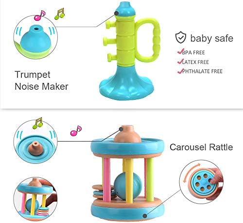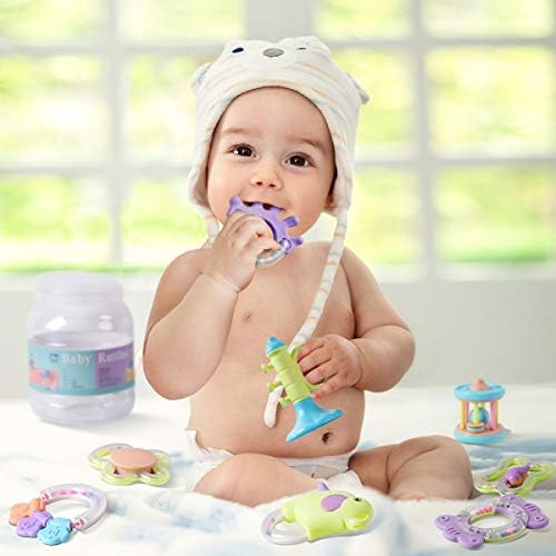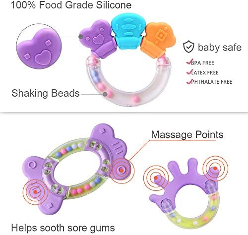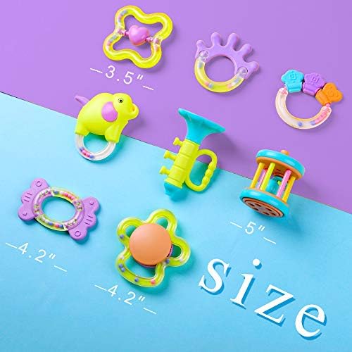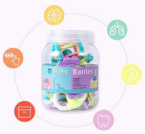 Safety: These baby teething rattle toys conform to the safety requirements of EU EN71, US CPSIA & ASTM F963. All toys passed physical and mechanical tests. Choose only the best toy for your child! Awesome Assortment! – This set of teething toys is perfect for any teething infant or child. Includes different bright primary colored teethers with rattles and shakers for different stages of your baby’s development. Durable candy colored storage box included. Uniquely suitable for bedrooms, kindergartens, nursery schools and playrooms. Can be played with anywhere imaginable, including outdoors, indoors, strollers and even in the car. Eco-Friendly ABS Material – All rattles and teethers can be wiped cleanly, safe for soft baby gums, and safe for touch. Recommend for ages 4 months and up. Soft, flexible and lightweight design with different textured shapes. Most of each piece is available for chewing, promoting better oral care, preventing cavities, helping teeth grow and preventing gum inflammation. Great Gift for Baby Showers – Can easily be combined with other gifts or perfect on its own. Makes for a great birthday present or Christmas gift as well! For a product to be an effective learning tool, children must be able to make inquiries and attempt to answer them on their own. Give your child a chance to explore and learn with this wonderful set of interactive teethers. Early Educational Learning – Different shapes, colors and shaking sounds stimulate listening, curiosity and shape identification. Advanced designs encourages active play and develop hand-eye coordination, imagination, creativity, shape recognition, color recognition, cognitive processes, fine finger and gross motor skills. Great Gift – Best for unisex, baby infants, boys, girls and infants. Perfect for birthday parties, festivals and holidays (Children’s Day, Christmas, Halloween, Thanksgiving & New Years). Give your child a gift that creates endless happy moments!