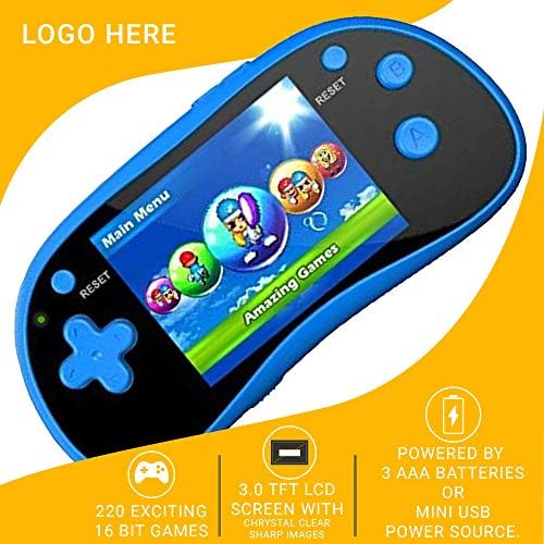 220 Exciting 16 bit Games with a 3.0 TFT LCD Screen with Chrystal Clear Sharp Images Type of games: Sports, Action, Adventure, Racing, Puzzles and more Built-in speaker, 3.5mm headphone jack, Volume control, Low power indicator. Built in 19 X High Resolution 3D Sports Games. Handheld Dimensions: 5.5″ x 3″ x 1″ Included in the box: USB Cable & AC Adapter. Powered by 3 AAA batteries or mini USB Power Source.