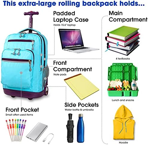 Price: (as of – Details) This 20-inch backpack on wheels for boys, girls and adults converts from a rolling backpack for teens and adults into a wearable carry-on backpack with shoulder straps. There’s a place for everything with 2 large compartments, 3 exterior zipper pockets, 2 mesh pockets, plus internal pockets, key clip and pen