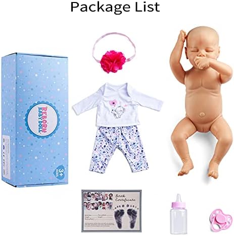 Newborn Baby Doll: Hush, she is a new to the world. A newborn baby needs more slumber and once she wakes up, she will need a pacifier to play. She is small and she needs more time and love. Be her friends and take care of her! Lifelike & Realistic Baby Doll: Her full body is made of vinyl and her skin has wrinkle which makes her skin feels like a baby’s skin. The hand-painted details and hand applied eyelashes make her come to life. Look, she is sleeping with a sweet smile that looks just like a real cute baby angel. Size: Her size is 17 inches from head to toe and you can wash her whole body and pose her. Her soft vinyl body also makes her soft enough for baby to embrace. Children’s Product Certificate: Conforms to the safety requirements of ASTM F963 and EN71 for ages 3+. What You Get: 1 x Baby doll, 1 x Nursing bottle, 1 x Magnetic pacifier, 1 x Birth card, 1 x Clothes set as pictured and 1 x Gift Box
