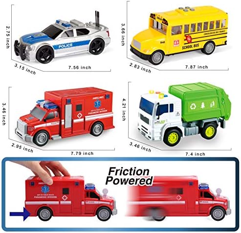 Price: (as of – Details) Product Description VALUED SET: This Friction Powered Vehicle Set Includes 1 School Bus, 1 Police Car, 1 Garbage Truck, and 1 Ambulance. All the vehicles are about 7”~8” long, 3” wide, and 3~4” High as estimated. The size might vary a little due to different shapes.REAL FUNCTION. Every toy of