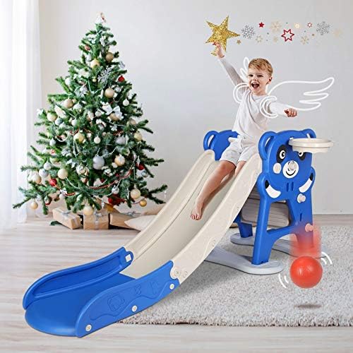 JOYLDIAS Freestanding Kids Slide, Baby Folding Slide Climber Equipment Set with Basketball Hoop and Ball, Extra Long Slide, Easy Setup, Sturdy Baby Playground Toddler Toy Gift Game Playset Indoor