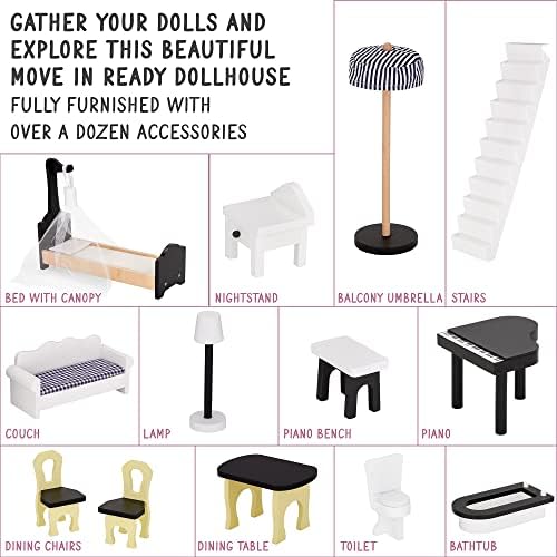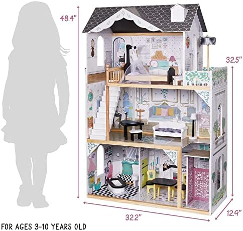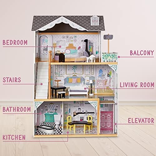 A KID’S DOLLHOUSE DREAMS COME TRUE | Discover a Multi-Story Mansion Beyond Your Child’s Wildest Imagination! | This Magnificent 4’ Wooden Dollhouse Provides Tots with a Life-Size Domestic Diorama Featuring 3 Floors, Multiple Rooms, a Built-In Elevator, Balcony & 12-Piece Accessories Set FINELY CRAFTED WOOD CONSTRUCTION | Unlike Cheap Cardboard & Other Inferior Materials, Our Heirloom-Quality Dollhouse is Built to Last for Decades with a Combination of Solid Pinewood, Plywood, MDF & Fabric Materials for Lightweight Maneuverability & Heavy-Duty Performance | Freestanding Design Gives Children Easy Eye-Level Access & Displays Beautifully on the Floor Like a Piece of Furniture DOLLHOUSE FURNITURE SET INCLUDED | Highly Realistic, Meticulously Decorated & Fully Immersive, Our Imaginative Play Set Has Little Ones Playing Straight Out the Box with 12 Lifelike Accessories: Living Room Sofa, Lamp, Kitchen Table, Chairs, Bathtub, Toilet, Piano, Bench, Patio Umbrella, Canopy Bed & Bedroom Nightstand | Rooms are Also Covered in Colorful, Detailed Wallpaper for Gorgeous Aesthetic WORKING ELEVATOR & JULIET BALCONY | Fun Extras Encourage Educational Play, Creativity, Imagination & Collaboration Including an Integrated Outdoor Balcony Space, Window Cut-Outs, Full-Sized Staircase & Gliding Elevator for Transporting Dolls from Floor to Floor in Style | Spacious Oversized Design is Perfect for Siblings, Play Dates, Daycare, School Recess & Birthday Parties | Recommended Age 3+ EASY TO ASSEMBLE FOR MOMS & DADS | Parents Won’t Stress Putting the Dollhouse Together, as the House Arrives with a Complete Hardware Kit & Handy User Guide with Step-by-Step Instructions for Fast Assembly | Give Little Ones a Truly Special Gender-Neutral Gift That Inspires Problem-Solving, Role-Playing, Empathy & More—Ideal for Christmas, Hannukah, Birthday, Holiday, Baby Shower or Graduation