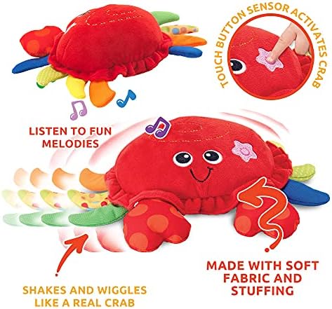 A GROOVY CRUSTACEAN – This adorable crab toy shakes and wiggles like a real dancing crab to the tune of its own melodies. Your little one will definitely enjoy watching it dance all day long. A PLUSH COMPANION – Designed for 3-month-old kids and older, this music toy is made with soft fabric and stuffing. When turned off, it can be used as a huggable plushie your child can sleep with. EASY TO OPERATE – Fitted with a soft touch sensor, it’s easier than ever to activate our dancing musical kids toys. Watch the crab jiggle and squirm to life with a tap of the sensor button. MUSIC TO YOUR EARS – Our crab crawling toys are programmed with 5 popular children’s nursery rhymes: Bingo, This Old Man, Farmer in the Dell, Polly Put the Kettle On, and Pop Goes the Weasel! FOR LITTLE ADVENTURERS – Our moving crab toys are perfect for encouraging little ones to crawl and develop their gross motor skills. Watch them try to catch their new friend as it scurries away!