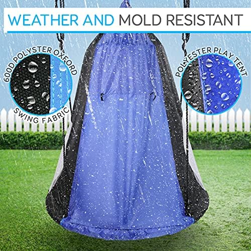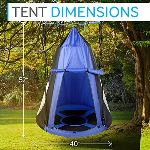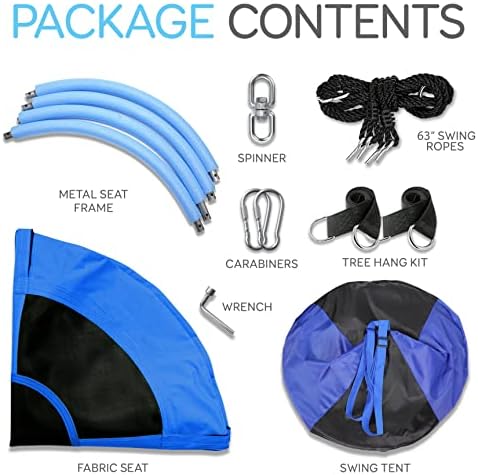 Features: – Relaxing Tree Swing Fun for Kids, Teens & Small Adults! – Universal Hanging Rope Swing Seat Kit: Mounts to Trees & Posts – Perfect for Use as a Reading Nook, Resting Pod, or Hanging Chair – Comfortable & Padded Saucer Style Seat Swing – Includes Detachable Hangout Play Tent – Adjustable Swing Height Placement – Excellent for Home and Backyard Installation – Easy-to-Assemble for Quick Setup & Portability – Super Sturdy Construction for Spinning Swing Safety – Weatherproof & Water-Resistant Fabric – Environmentally Friendly Construction – For Indoor / Outdoor Use – *Some Assembly Required What’s in the Box: – Round Saucer Swing Seat & Cover – Detachable Play Tent – (2) Swing Ropes Technical Specs: – Rope Swing Length: 63’ ft. -Each – Max Weight Support: Up to 600 lbs – Swing Seat Size (Diameter): 40’’ -inches – Play Tent Size (D x H): 40’’ x 52’’ – inches – Construction Materials: Polyester Play Tent, Steel tube Metal Swing Frame – Total Swing Kit Assembled Size with Frame (L x W x H): 39.4’’ x 39.4’’ x 63’’ -inches TREE HANG KIT AND SWIVEL SPINNER: Swing tent comes shipped with everything you need to hang it. Hang the tree straps from any tree or swing set and clip in with the 2x carabiners or use the swivel spinner to add a fun spinning motion to the swing DETACHABLE WATERPROOF HANGOUT PLAY TENT: The tree swing tent has a 40″ inch seat size and a 40″Dx52″H removable waterproof hangout play tent to give you ample of space to lounge inside. Perfect for use as a reading nook/resting pod/hanging chair WEATHERPROOF: The saucer swings hanging tents for kids has a spin safe super sturdy construction and weatherproof/waterproof fabric. These pod swings for kids makes a fun addition to any backyard tree, patio, or porch. SUPPORTS UP TO 600 LBS: This sensory swing indoor outdoor hanging pod chair has a weight capacity of up to 600 lbs to support multiple passengers for a relaxing tree swing fun for kids, teens, and small adults SAUCER STYLE CUSHION: The comfortable and padded flying saucer style swing seat together with a gentle swinging movement encourages balance, supports sensory needs, provides a backyard relaxing therapy swing for kids and calms hyperactive children