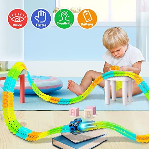 What’s Include:Magic Car Tracks bend and glow like you’ve never seen before; This 146 piece set includes 138 in of track plus a Light-Up Race Truck with LED lights that keep the tracks glowing bright. Create Any Shape: With Serpentine Technology, you can quickly and easily bend, flex, and curve the track magically in 360 degrees however you want – even while the race car is zooming around. Easy to Assemble: Just snap the pieces together and you get a fully customized speedway of your own creation, and when you turn off the light, Racing car glow super bright. Safety & Detailed : Made of toxic-free materials, Each construction track is in a unique design;Give your kid age 3 and up hours of stimulating, creative hands-on activity. Perfect Wish List Gift: Make a great gift for your child; You can even use items around your house like books, boxes, or trays to make tunnels, ramps, bridges, and more for endless hours of fun.