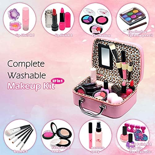 💕【Fashion girls special bag】:A bag specially designed for princesses Just like Mom’s makeup case.Kids could organize her many small cosmetics well and is easy to carry it.Wherever she go, she could play with her favorite cosmetic set.This washable makeup toy fulfills the dream of every little princess! 💕【Rich and varied toys set】:girls makeup for kids include 1* powder, 2* lipsticks, 3* lip glosses, 1* blushes, 5* brushes, 1* spray bottle, 3* eye shadows, 1* nail art set, 1* hair comb and1* cosmetic bag, 1* eyebrow pencil, 2* nail polish, 1*mascara, 1*beauty blender, little girls makeup kit total of 28 pcs. 💕【Easily Washable X 100% Child Safe】 Washable makeup set use water-soluble formula, no added preservatives, mild and non-irritating, no burden on the skin. It can be washed directly with water, easy to clean, not irritating. They ensure your children are safe to play.Please let the kids use children’s washable cosmetics to protect their delicate skin, rather than using your adult cosmetics. Adult cosmetics have a higher content of heavy metals and chemical components. 💕【Best gift choice for party/entertainment 】:These are the perfect gifts for the little girl to rejoice and scream.Suitable for any occasion, birthday, pretend play, princess parties, play-dates, Christmas etc, An ideal gift for age 3 4 5 6 girls and for birthdays, Christmas. 💕【Perfect gift% 100 purchasing power】: play makeup for little girls These are the perfect gifts for the little girl to rejoice and scream。If you have any quality problems, or are not satisfied with our children makeup toys, please feel free to contact! Give processing and full refund!