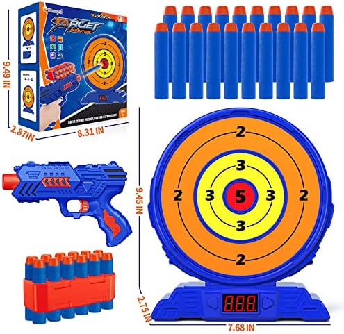 2021 Amazing Shooting Toys: The great target shooting game set includes 1 Digital Shooting Target with 3 layer rings, 1 Foam Dart Toy Gun, 12 Soft Foam Darts, 1 Dart Clip. Perfect target size is more suitable Shooting (approximate): Diameter: 18.5 cm / 7.2 inches / three layers, the design of the target scoring ring divided by color is convenient for shooting. Kids will love the brightly colored design and different shooting modes. Auto Reset Target System: Get 2 points for hitting the orange ring, 3 points for hitting the yellow ring, 5 points for hitting the red center ring, and hit the ring with sound: “Two points” “Three points” “Full Mark”. The higher the score area, the higher the difficulty level, which brings more exciting experience in shooting. The score will be automatically accumulated and displayed on the digital scoreboard and reset when the score reaches 999. This will keep the child entertained for hours. Easy To Operate: The base and the target are integrated, install 3*AA batteries then turn on, the real fun will begin. The electric digital shooting game set is very easy for kids to operate. As long as the target and gun come with you, it is easier to carry than the traditional Amazon shooting toys in the past. Compatible with Nerf N-strike Elite, Nerf Mega and Nerf Rival series guns and other brands of Blas Safe & Fun: The Soft Foam darts adopt soft, safe, and harmless EVA materials that do no damage to their targets — household items, and people. It’s kid-friendly and safely targets practice shooting for kids. This is the best gift for kids age 5, 6, 7, 8, 9, 10, 11, 12 for birthdays and holidays (Children’s Day, Christmas, Halloween, Thanksgiving & New Year). Enjoy Shooting Games: the astonishing sighting device helps train kid’s hands-on ability and hand-eye coordination. The circular electronic target allows your child to express himself or herself, making a scoring sound when hitting the target ring will easy to build confidence for the kids! Help them develop, intelligence, memory, confidence, patience, socialize and cultivate creativity! Come on, turn on the power button and turn on the latest shooting mode in 2021.