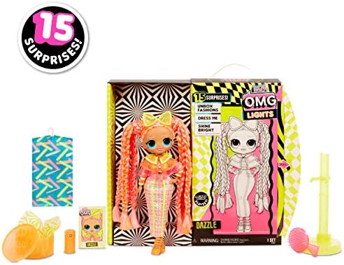 Unbox 15 surprises with L. O. L. Surprise! O. M. G. Lights fashion doll, Dazzle, with stunning features, styled hair and articulated for tons of poses! Dazzle is the big sister to fan favorite L. O. L. Surprise! character, Glitter Queen. Dress Dazzle in her fierce fashions and fabulous accessories. Pro Tip: Hands are removable for easy dressing. Shine the included black light on Dazzle to reveal black light surprises. Package becomes a reusable play space. Slide open for a surprise reveal – Dazzle’s picture turns from black and white into color! Includes fashion doll, fashions, shoes, accessories, hat box, black light, hair brush, garment bag, sticker, hanger, doll stand and reusable package play space. Collect all 4 L. O. L. Surprise! O. M. G. Lights fashion dolls.