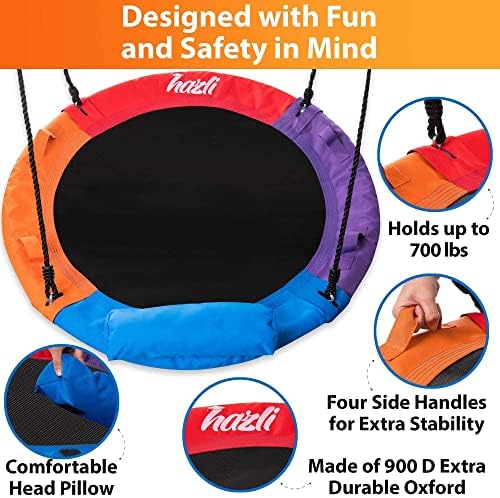 UNIQUE SAUCER SWING FOR KIDS – Our tree swings for outside have 4 safety handles and a comfy pillow. Hazli outdoor swings for kids are easy to attach to any swing set or tree due to the FREE straps included in all kids swings for outside package. STURDY SAUCER SWINGS FOR OUTSIDE PLAY – The tree saucer swing for kids is made with a top layer of high-quality 900D oxford material. This child round swing sturdy fabric withstand rain and strong UV rays and is a durable outdoor round swing. FULL SAUCER SWING SET – Easy to mount saucer tree swings for kids include a key wrench, 2 carabines, 2 extra straps to hang them on higher tree branches and instructions. Attach our outdoor round swings for kids to any tree or swing set. LARGE SAUCER SWING – Our kids swings for trees fit children of different ages, weights, and heights and is very comfortable even when used by teens. With 4 long ropes, this round swings for kids allow you to adjust the height as needed. SATISFACTION GUARANTEED – To be sure that buying our tree swing is the best decision, we offer 6 Months No Questions Asked Money Back Guarantee. Feel free to contact us if any questions.