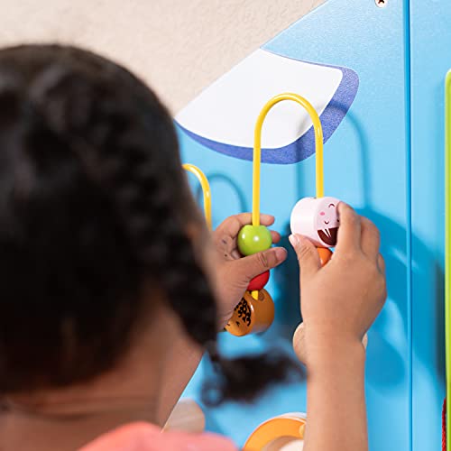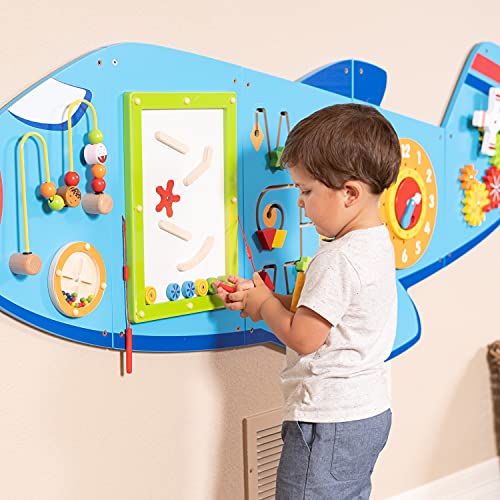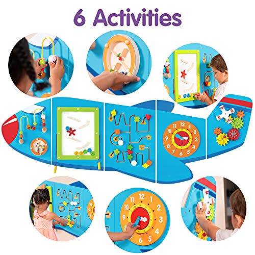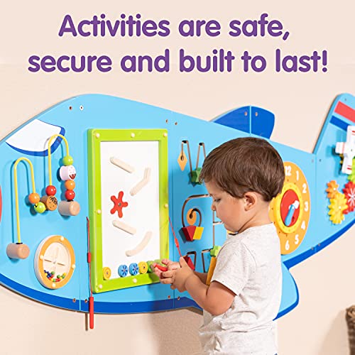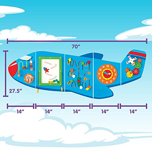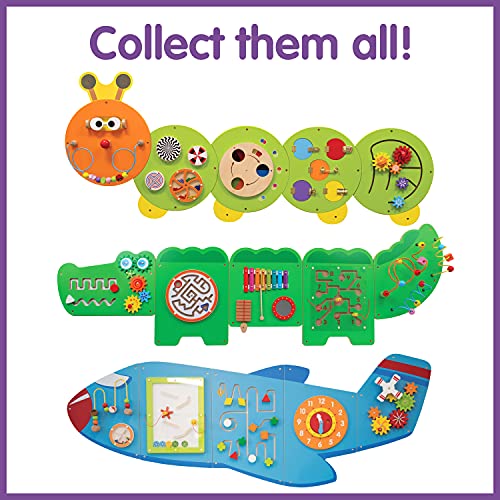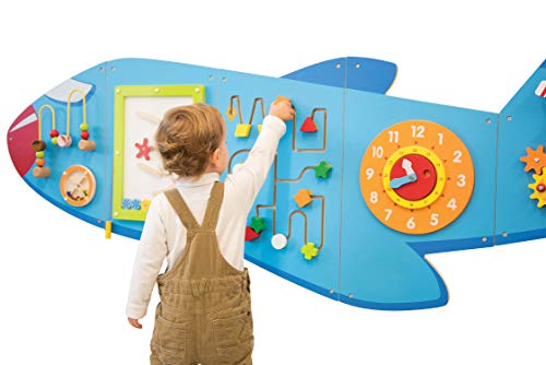 ZOOOOM INTO PLAYTIME — Designed for toddlers aged 18mplus, this brightly colored activity set includes 6 large wall-mounted activities that teach as well as entertain DESIGNED FOR LITTLE PEOPLE — Fully tested according to the highest consumer standards, this airplane wall-mounted activity center can be mounted at the right height for young ones EASY ASSEMBLY AND LIGHT WEIGHT — Each of the 5 Panels includes fixing holes and attachment screws for easy mounting LET CURIOSITY TAKE OFF — The airplane includes beads on a wire, a rolling disc with sound, a magnetic block slider, a trace and track toy, a clock with moving hands and turning gears LEARN THROUGH PLAY — The Airplane Activity Wall Panels help to build motor skills, hand-eye coordination, descriptive language, shape, space and reasoning skills PERFECT FOR SMALL GROUPS — At 5ft 7.5in long, there is ample space for small groups of children to be all occupied at once IDEAL FOR CENTERS, HOMES AND WAITING ROOMS — Being wall-mounted, the panels don’t occupy floor space, making them an ideal resource to keep kids entertained while waiting for the doctor. They’re a beautiful wall decoration in a toddler’s bedroom too
