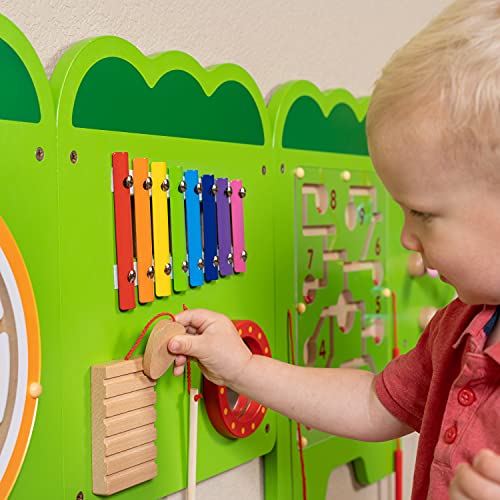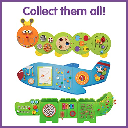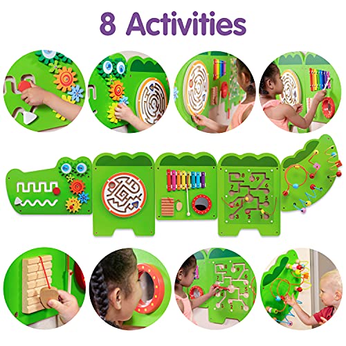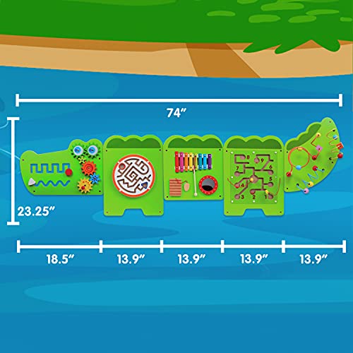 TURN WALLS INTO PLAYGROUNDS — This multi-sensory busy board contains 8 different activities. The 5 panels feature percussive instruments, mazes, rotational pieces, interlocking cogs and more FOR AGES 18m+ – Fully tested to the highest consumer standards, this Montessori sensory wall toy can be mounted at just the right height for little learners. DURABLE AND EASY TO ASSEMBLE — The 5 panels include fixing holes and attachment screws for easy, sturdy mounting. And the activities are durable and designed to last for years without breaking. EXPLORE MONTESSORI TOYS — This Montessori busy board allows children to follow their curiosity. Watch them build motor skills, coordination, descriptive language, shape, space and reasoning skills. KEEP LITTLE ONES OCCUPIED — Use these Montessori toddler activties to keep your children or grandchildren occupied without using screens PERFECT FOR SMALL GROUPS — At 6’2″ long, this wall panel toy is perfect for small groups of children to play together and socialize ADORABLY INTERACTIVE WALL DECOR – Looking to decorate your toddler’s bedroom or play area. This cute crocodile activity center will add a fun feature to any room without taking up space on the floor. MIX AND MATCH PANELS – Our panels look great by themselves and with friends Add our Airplane (Amazon No.B07XPRCT86), Bear (Amazon No. B0892TXYZC), Horse (Amazon No. B07XGNJHC4) or more