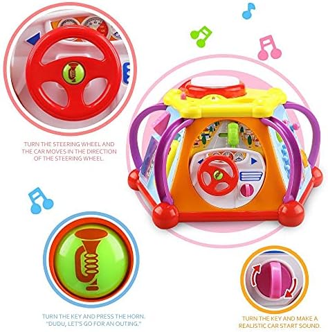 Price: (as of – Details) 6 different sides of playing with 15 different dynamic games for entertaining kids. Tap the Drum, Pull, Push & Hold the Knobs, Press the Button to Make a Call, Turn the Key, Press the Horn, Steer the Wheel, etc.Includes (15) interactive features – Encourages development of early skill sets. Calm