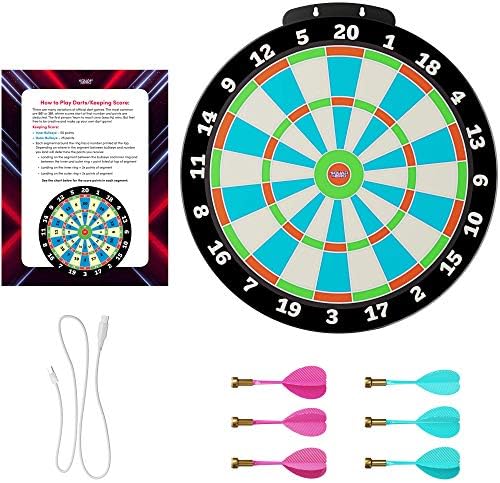 🏅 FIRST EVER LIGHT-UP MAGNETIC DART GAME: The classic dart sport – completely reinvented for kids and adults! The rules are the same – but the board lights up with an innovative LED backlight. The dartboard is constantly backlit doubling as a cool room decor. Powered by USB or AAA batteries. 🎯 ADVANCED DARTS: The included darts boast the following features: MAGNETIC – safe for children, pets, or furniture. AERODYNAMIC – Uses neodymium magnets and engineered with precision to ensure optimal throw and accuracy. GLOW IN THE DARK – The darts glow in the dark as well. 🔧 KIT INCLUDES: 14″ Light-up dartboard, Micro-USB cable, 6 glow-in-the-dark magnetic darts (3 red and 3 blue), scoring chart. POWERED BY USB or BATTERY: Connect it to a power outlet with the included USB cable. Alternatively, you can power it with 4 AAA batteries (not included). 🎁 THE PERFECT GIFT FOR ALL AGES: Everyone is guaranteed to have a blast! Makes a great addition to the bedroom, game room, dorm, garage, or play area. 😊 100% SATISFACTION GUARANTEED: Love it, or your money back! If you are not satisfied with the kit, we’ll refund you 100% of the money, no questions asked.
