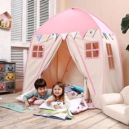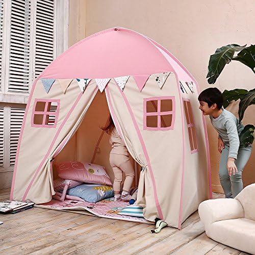 UNIQUE DESIGN & Large Size:Different from the easy break apart castle and decoration Indian tent ,our tent is much sturdier and just like a real house.Children can play in freely without worrying about it will fall apart.This LARGE kids playhouse can accommodate parents and children together,even a Children Bed can be put in! NATURAL PREMIUM MATERIALS: This kids play tent is made of 100% natural, non-toxic, unpainted cotton canvas. The frame is made of sturdy fiberglass poles and all of the seams are reinforced. Best quality for your child to sleep and play in. EASY ASSEMBLY & PORTABLE: The playhouse is easy to set up with our instruction,only 2 steps. Come with carrying bag for storage or taking along after disassemble. Carry your child’s favorite tent anywhere with you. CONSIDERATE DESIGN: 4 windows keep good air circulation in the tent, and you can also keep an eye on your child through the windows. Both side doors with zipper closure allow kids to get in and out freely. 100% SATISFACTION GUARANTEE: Contact us with any issues. We are always here to serve. We promise to provide free replacement poles for life long.