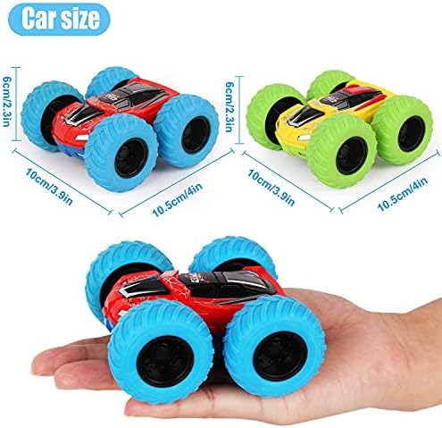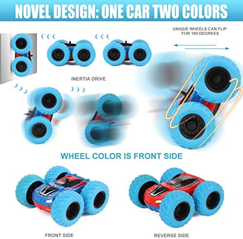 🚗【NOVEL PULL BACK CAR TOYS】2 pack fantastic double sided monster toys car, which each side has a different color. Compared with other pull back cars on Amazon, our pull back car is more novel in appearance design. when encountering obstacles, the car will automatically flip over and drive to the space of obstacle-free objects. (Note: Only the front of the product can drive. A tab that sticks up higher than the wheels of the car on the back will make the toy car rotate 360°, bringing more fun.) 🚙【FRICTION POWERS, NO BATTERY REQUIRED】No batteries required, no remote controller, the inertia car only needs to be pushed gently, easy for kids to play with. These truck toys with strong power 4 wheel inertia drive, just press the vehicle down and move it back slightly to get strong power, then release them quickly, these cars will run to all-direction with strong inertia power. 🚕【EDUCATIONAL TOYS】Kids will be surprised by the upright running and amazing stunt flipping of this inertia monster toys car! Due to its inertia of this pull back vehicles , you pull it back and run it. It can be played on any ground with ease and confidence, be it in the sand, grass, muddy patches, or rocky trail paths. Push this inertia car forward and run forward to bring fun and excitement to your little ones! 🚗【DURABLE ABS MATERIAL】The monster toys truck made out of premium ABS plastic non-toxic and tasteless environmental spray painting, with anti-collision & shockproof protection, environment friendly and safety. Monster toys trucks has a cool looking with super strong toughness, anti-falling & durable, which are safety tested, no worries for your kids playing. 🚕【STIMULATE KIDS INTEREST】With these monster toy trucks, your kids are able to build a racing game to gain more fun in the playing time. Adults can accompany children to play monster toys trucks, which is conducive to promoting the affection between parents and children and allowing children to grow up healthily. It’s the perfect birthday Christmas and other festival gift for your boys and girls, young toddler.