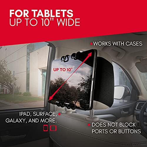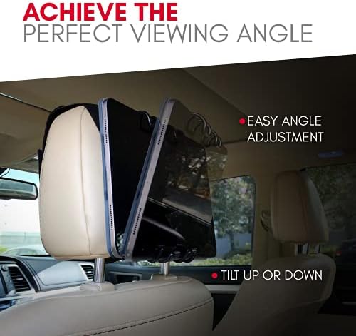 ALLOWS YOU TO DRIVE PEACEFULLY: This mount is a road trip essential. Keeps your kids entertained so you can focus on the road.PLENTY OF MOUNTING OPTIONS: The versatility of the strap mount allows you to attach the tablet holder either vertically or horizontally on virtually any headrest.VIEWING ANGLE ADJUSTABILITY (Upgraded Feature): The clamps are adjustable so you can set the perfect viewing angle.EASY INSTALL AND PORTABLE: Attach or detach the mount in a matter of seconds so you can put it in storage or transfer to another vehicle.WIDE TABLET COMPATIBILITY: Securely mount any tablet up to 10″ wide and enjoy a vibration-free viewing experience.