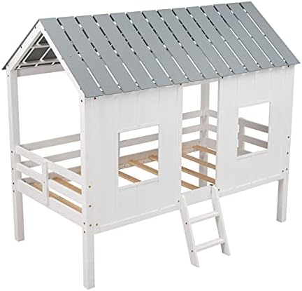 Price: (as of – Details) Twin Size Low Loft House Bed with Roof and Two Front Windows , for Teens Boys & Girls Bedroom,WhiteDimensionProduct Dimension: 80.4″L*45.2″W*71.4″HBed Dimension: 80.4″x45.2″x38.5″Total Height: 71.4″ Recommend Bed Mattress Thickness:8-10″Overall Product Weight:121lbBed Weight Capability:250lbNumbers of Slats:8pcsDescriptionMaterial: Pine Wood+MDFSize: TwinColor: Loft White with LadderNumbers of Package: 2Assembly Required: Yes[Better Sleeping Environment] Thanks to the semi-enclosed space,the
