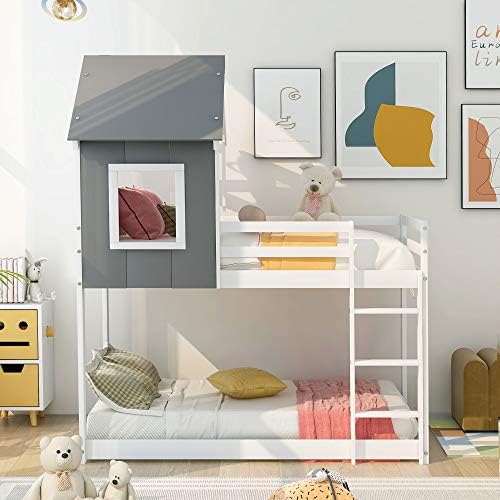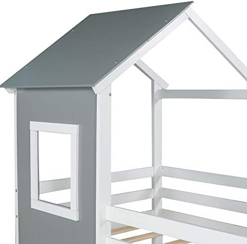 Merax Twin Low, House Roof, (New), Bunk Bed-Gray and White