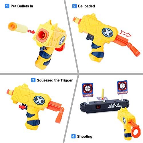 Price: (as of – Details) Product Description 20 PCS Safety Soft Bullets To make sure the kid safe.We use the soft materials to make bullets.Ensure play-ability and safety at the same time.Parent can feel free to use this products with your kids. Electronic Target with Gun&Bullets This product come with two gun and a electronic