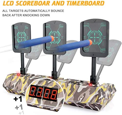 【Upgraded Running Shooting Target】 : The shooting target toy set includes 1 military-style target shooting gallery, 100pcs foam darts, 2 hand wrist bands, 3 sets of target cards, 1 mobile base with 6 splicable tracks.Static and moving 2 game modes for you to choose.Compatible with Nerf N-strike Elite,Nerf Mega & Nerf Rival Series Guns and Other Brands’ Blaster. 【Digital Screen with Scoreboard & Timer】 : Compared with the ordinary target which only has one single score display, our targets equipped with an lcd scoreboard and timer can help children easily keep track of the score and time. Kids can take turns to compete for a higher score. 【Auto Reset Target System】: When all three targets are down, they will automatically rebound into position after 3 seconds with an encouraging sound. The auto-reset function enables continuous shooting and keeps the fun going. 【Realistic Sound & Light Effect】: Every time the target is shot down, it will be accompanied by the sound of realistic gunfire and broken glass. At the same time, the indicator light will flash, let you be immersed in the fun of shooting games! 【Ideal Gift for Kids】 : This mobile shooting target for nerf toys not only exercises children’s aim and shooting ability, but also improves parent-child bonding