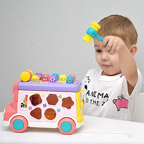 Price: (as of – Details) Product Description Multifunctional School Bus Toy Shape Sorters Learn colors, numbers & shapes. Push & Pull, Sound & Light Practice gross motor skills & grip strength. Gear Linkage & Animal Matching Develop hand-eye coordination. Get to know some animals. Whack-a-mole Game Top panel mode 1: Including 2 hammers for interactive
