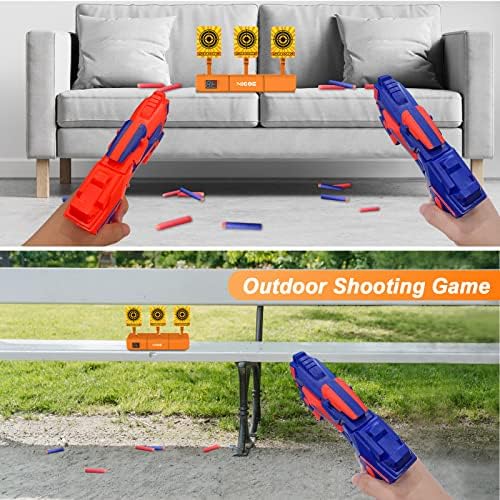 【Digital Shooting Toy Set】This set of digital shooting target includes: 3*digital targets, 2* shooting blaster, 40* foam darts, 1* screwdriver 1*shooting gallery. Our target toys are compatible for compatible with Nerf Mega, Nerf N-strike Elite & Nerf Rival Series Guns, and Other Brands’ Blaster. 【Automatic Reset System】The gun and target set adopts an automatic reset system, after hitting 3 targets, it will automatically rebound into position within 3 seconds so that you could easily and quickly enter the next round. The sensitive LCD screen can display the score in time, when the screen shows “90”, it will automatically reset to start a new round of games. 【Realistic Shooting Experience】Great indoor and outdoor children’s toy target shooting ! Every time it hits the target, it lights up. The sound of gunfire and broken glass gives you an immersive shooting experience. Choose the solo mode to play on your own, or choose multiple modes if you are playing with friends or family. Both way, you can enjoy the fun of shooting targets toy. 【Enjoy Shooting & Improve Skills】This shooting targets toy helps to train the child’s manual skills and hand-eye coordination. Helps children develop intelligence, memory, confidence, patience, social interaction and creativity! Shooting targets for kids outdoor can choose the solo mode to play by themselves, or choose multiple modes when playing with their parents or friends. Both ways, you can enjoy the fun of target toys. 【Gifts for Kids Ages 8+】Target guns for kids is great for boys and girls to play indoor or outdoor! Boy gifts nerf is the best gift for on Birthday, Holiday, and Christmas.Please feel free to contact us, we provide 30 days for no reason to return.