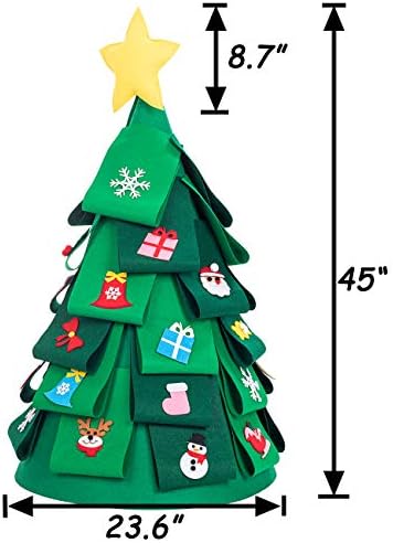 Price: (as of – Details) Product Description specification: Material: Felt Color: as shown Product size: H: 45in (3.8ft) x D: 23.6in (2ft) Package Includes: 1x cylindrical felt cloth, 19 x light green felt leaves, 19 x dark green felt leaves, 37 x decorative accessories, 1 x five-pointed star hat, 1x hot glue stick, 1 x