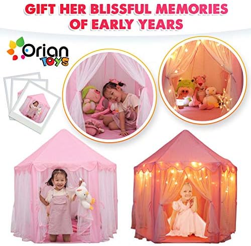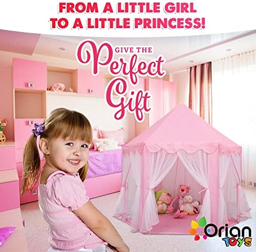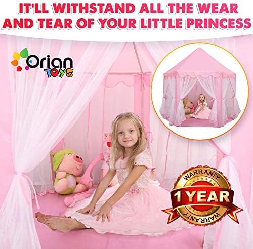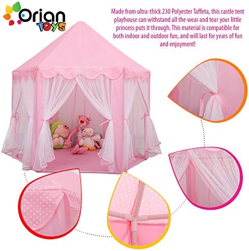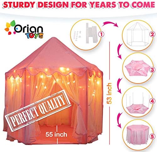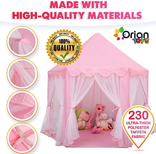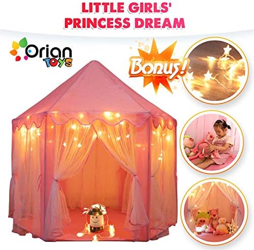 [HIGH QUALITY, DURABLE DESIGN] – Made from ultra-thick 230 Polyester Taffeta, this princess tent with lights can withstand all the wear and tear little girls put it through. This material is compatible for both indoor and outdoor play, and will last for years of fun and enjoyment! [#1 IN CHILD SAFETY – ASTM & FCC CERTIFIED] Keeping your kids safe is our first and foremost priority at ORIAN. That is why we designed our kids playhouse tent by the strike standards of the American Society for Testing and Materials, which helps to ensure that only quality, raw materials are used. Rest easy knowing your kids are protected from harmful chemicals and dangerous designs aspects with our princess castle play tent. [BONUS LED STAR LIGHTS] – Included with each princess play tent are an FCC certified 4.5M string of 40 LED star lights (3 AA batteries not included). These glimmering and shining stars help to create even more of a healthy and dreamy environment for your little girl. [EASY TO CLEAN AND MAINTAIN] – When your little kids are done playing, you can easily clean the tent. It is made of hard-wearing materials that allow you to simply apply safe cleaning solutions and wipe the playhouse clean! [1 YEAR HASSLE-FREE WARRANTY] – On top of the 30-day money back guarantee we provide you, we also offer you a complete 1-year warranty! If for some reason you are not satisfied with your purchase just let us at ORIAN know! We will provide a prompt and helpful solution, offering you a full refund or a new Orian Princess Castle Playhouse Tent!