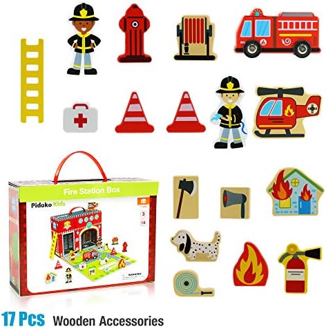 Pidoko Kids Fire Station Playset – 19 Pcs – Magnetic Portable Box – Easy Storage – Perfect Travel Toys Gift Set for Boys and Girls – 3 Year Old and Up – Wooden Accessories