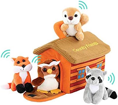 Plush Woodland Animals with Country House Carrier for Kids- 5pc- Talking Animal Interactive Toy Set- Stuffed Owl, Raccoon, Fox & Squirrel- Great Baby Shower Present for Boys & Girls by Etna