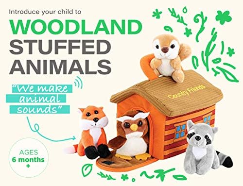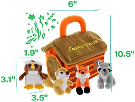 What is more amazing than watching you child learn and Play? With this Plush Woodland Friends Talking Animal Set, you will get to do just that. They will be amazed and entertained with this interactive set with soft plush animals you can hear come to life with one little squeeze! Their imaginations will run wild with the hoot of the owl, the chirps of the squirrel, and the squeaks of the fox and raccoon! Interactive toys instinctively help children develop their imagination, promoting motor function and coordination, while nurturing their creative spirit. This set is designed to go on every adventure with your child! Conveniently designed and sized to go to sleepovers, to grandma’s house and more! This set includes an adorable country house carrying case with a handle perfect for little hands with room inside for all 4 woodland friends to fit snugly inside. These make the perfect gift too. Share the imagination and delight with other children in your life. Introduce Your Baby To The Everyday Animals Of The Country – The owl and the squirrel make recorded sounds and the raccoon and fox make a squeaky sound to capture your child’s attention! Nurture And Inspire Imaginative Play – Interactive toys help children develop their imagination, promoting motor function and coordination, while nurturing their creativity. Durable & Safe For Long Lasting – Etna products are made to be safe for babies and toddlers 6 months & up. This Woodland play set will make the perfect baby shower, first birthday, or Christmas gift! Take Your Woodland Friends On The Go – the country house carrier measures 6″ L x 6″ W x 10.5″ H (with handle). The woodland animals (owl, raccoon, fox, squirrel) measure 3.5″ L x 1.9″ W x 3.1″ H. Just Give Them A Squeeze – squeeze each huggable animal and hear them come to life! The animals will make a realistic sound helping your child learn more about the noises animals make.