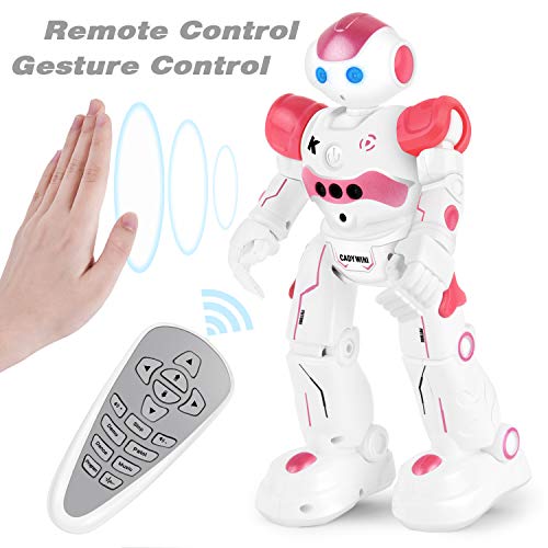 - 【Remote and Hand Gestures Control Robot】You can use the remote or do hand gestures to control this smart robot toy,it can move forward,backward,turn left and turn right simply through your gestures.The eyes light up with bright blue LED’S when it moves.