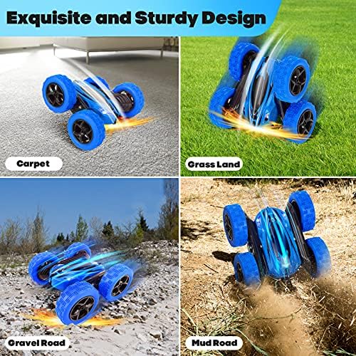 Multifunctional Stunt Car. It can provide different playing experiences. This RC car has double sides racing, moving forward, backward, turning left, right, spinning on both sides, 360 degrees tumbling and spinning. It can also turn into a dance car, kids can enjoy great fun with various stunts playing. Powerful 2.4GHZ Remote Control. Give kids the pleasure and excitement of controlling the RC cars. The remote control car utilize 2.4GHZ technology, It enables multiple RC cars to compete together at the same time and place for long control distance. The simplicity of the remote and agility of the car work for a zero frustration experience. Long Lasting Battery. A great battery capacity gives you double fun every time you play with RC cars. Equipped with two 3.7V 14500/500 mah rechargeable batteries with a USB cable for remote control car. Not only lasts 25-30mins playtime but also easy to install. Exquisite and Sturdy Design. It offers you realistic racing and a great off road game experience. It can hold up well through lots of crashes due to high quality ABS plastic and a smooth exterior. Moreover, It comes with threaded tires which helps for a firm grip. It suits for indoor and outdoor play in all terrain. Ideal RC Car Gift for Kids. It is a great choice for cultivating kid’s creativity, imagination, and practical ability. The streamlined design not only speeds up the movement but also protect children. It is an excellent birthday and Christmas toy gift for kids who love RC cars.