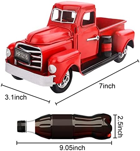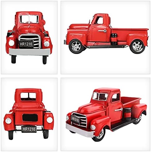 ✔RED TRUCK GIFT FOR YOU:Great design gift with a red truck, a tree, 3 colorful gift boxes and 3 handmade flowers. Abundant Christmas gift boxes make your home full with Christmas atmosphere. t is a preferable gift for you kids. ✔EXQUISITE WORKMANSHIP: The vintage truck decor is made of quality metal material, which is sturdy and reliable to use, with a smooth surface. A red car and a green tree all is for celebrate your holiday. ✔DETAILS RED CAR: The small red car can move as a real car on your table. It will become a treasured toy of your children. Also it will be an essential part of Christmas. The car is in classic red, which is lovely and vivid for your room. ✔APPROPRIATE SIZE: The metal pickup truck decor measures approx. 7 x 3 x 3 inches. The back of the truck is empty for a small Christmas tree and 3 gift boxes and 3 handmade flowers. It is a Collectible truck item for you. ✔VARIOUS OCCASIONS: It can be a lovely toy for your baby, a vivid decor for your room, a beauty for decorating Halloween, Thanksgiving or other holiday parties.