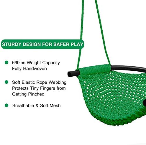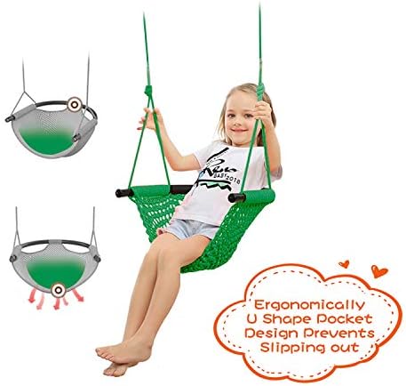 Material & Adjustable Rope: Strong and long lasting Polyester rope. Protects your little one’s tiny fingers from getting pinched and provides a comfortable grip. Rope length is from 55”/140cm to 77.8”/200cm Large Seat Area: 17.7”/45cm Long, 17.3”/44cm Wide. The U shape pocket and frame form an enclosure to prevent backflip Easy to Install: All neccessary parts included. 1 rope swing seat attached to braided Polyester rope, 2 tree straps. You would not believe how easy the installation is Safety Comes First: Fully Hand Knitting. Durable and comfortable with breathable and soft mesh. Holds up to 660lbs/300kg. A great gift for kids, playmates, birthday, Christmas A Great Swing Set Accessory: Our heavy duty rope swing can be added to a tree, swing set, jungle gym, other outdoor playset, even at home on the beam, ceiling