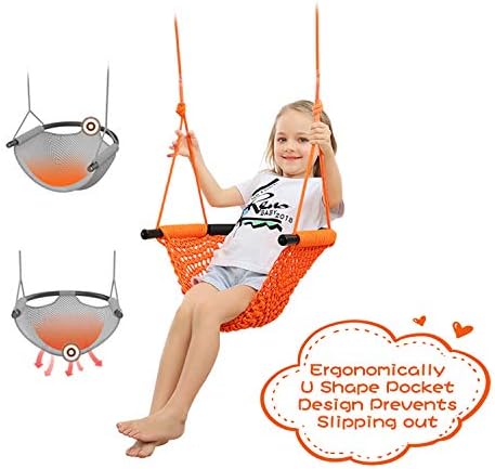 Material & Adjustable Rope: Strong and long lasting Polyester rope. Protects your little one’s tiny fingers from getting pinched and provides a comfortable grip. Rope length is from 55”/140cm to 77.8”/200cm Large Seat Area: 17.7”/45cm Long, 17.3”/44cm Wide. The U shape pocket and frame form an enclosure to prevent backflip Easy to Install: All neccessary parts included. 1 rope swing seat attached to braided Polyester rope, 2 tree straps. You would not believe how easy the installation is Safety Comes First: Fully Hand Knitting. Durable and comfortable with breathable and soft mesh. Holds up to 660lbs/300kg. A great gift for kids, playmates, birthday, Christmas A Great Swing Set Accessory: Our heavy duty rope swing can be added to a tree, swing set, jungle gym, other outdoor playset, even at home on the beam, ceiling