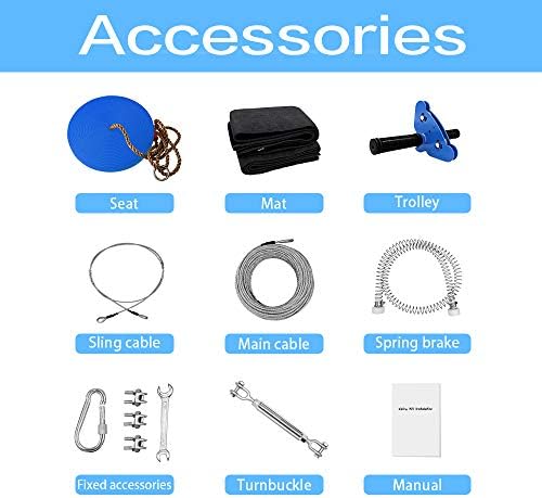 【Safe and Durable】 Our zip line kit are equipped with 330ib stainless steel spring brake as a braking system, which have been strictly tested and this zip line meets the international quality standards (rohs & ce) .We have carefully constructed a product that guarantees complete safety for kids. 【Perfect Holiday Gift Idea】 This backyard zipline can be played by both adults and children. You can spend endless hours of backyard fun with your children and enjoy unforgettable moments .Our zipline also engages kids in active play and helps them develop strength, athleticism, and balance.you will have an amazing backyard playground that will make you the coolest parent! 【Adjustable Seat】 This backyard zipline kits can easily accommodate kids of different heights with its adjustable seat, with non-slippery and comfortable grip, which can always accompany the growth of children. 【Environmentally Friendly Design】 The zipline kit includes a 98 foot zipline and a 5-foot sling, with eyelets and tree protection pads to prevent damage to the trees. Children learn to protect nature while having fun from this joyful gift. 【Detailed Installation and Safety Instructions 】 The instructions of zipline kit is easy to install.Assemble the ziplines kit with your clever little ones, while the instructions you’ll find describe the whole process step-by-step.