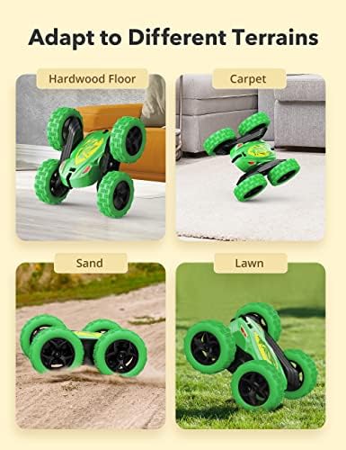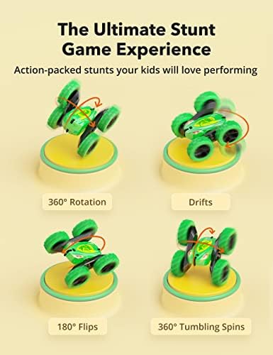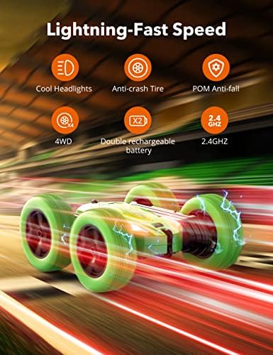 SpecificationProduct Scale: 1/28 Full functions double-sided stunt RC car Material: ABS + TPR + PP + POM Frequency: 2.4GHz Control Distance: 30 m Charge Time: 1.5-2 hours Playing Time: 40-60 mins (two batteries) Speed: 10 KM/H (maximum) Battery Power: 3.7V 600mAh battery (Included) Controller Battery: 2 x 1.5V AA battery (Not Included) Full-Functional Stunt Car: RC Car can flexibly move forward/backward/left/right, and perform 180° flips, 360° tumbling spins, 360° rotation and drifts, brings your kids amazing stunt game experience High-Speed Running: Equipped with 2 powerful motors and 4 wheel drive system, RC stunt car can run at a maximum speed of 10 KM/H, makes your kids feel thrilled and excited while controls the car Extended Running Time: 2 600mAh rechargeable batteries provides 40-60 minutes of off-road racing, a rechargeable battery supports 20-30 minutes of playtime Superior Durability: Made of premium POM material that is firmer and more durable than ABS, this RC cars can withstand all kinds of crashes and bumps; and 4 shockproof tires with concave-convex texture can move smoothly on different land surfaces, such as hardwood floor, carpet, lawn, sand, etc Perfect Holiday Gifts for Kids: Remote control car is a great gift for 6+ year old kids on Birthday, Christmas and other festivals. Your kids will have a wonderful stunt game with his/her best friends to make playtime more fun