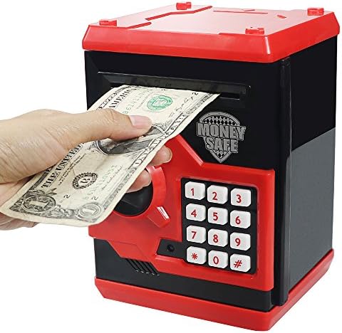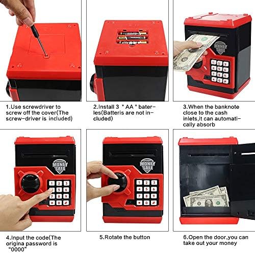 Material: High Quality and Premium ABS. Safe simulation design. Great gift for children kids. Automatic Roll Money ATM Bank: Put the paper money on the scroll, it can be rolled into the machine automatically.(But it doesn’t work if the paper is too old or too soft) High-capacity: Can store 600 pieces of coins or 100 pieces of paper money. interesting & funny, a must item for child or gifts, greatly help you to develop a good habit of saving money.Batteries: 3 pieces of AA batteries (not included). Password protection: four electronic password protection, iF you press the wrong password, it will be issued. Birthday gift and Christmas gift:Improve The Child’s Property safety Consciousness: “my own safe” guarding their own things. It can be used to store toys, jewelry, baseball cards, etc. insert coins into the top of the money bank and you insert bills into the sideļ¼just use the safe as a piggy bank.