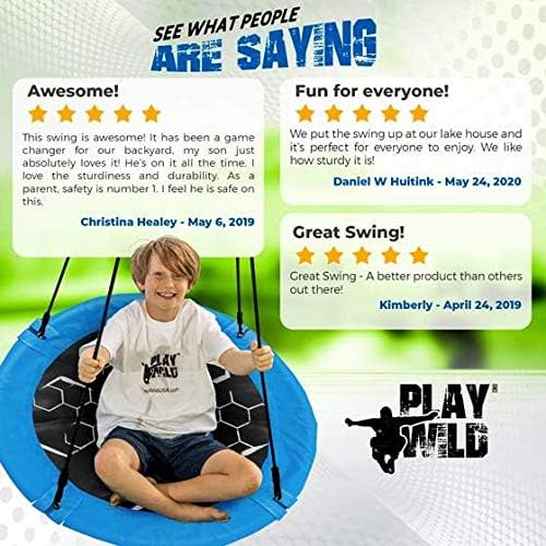 IMAGINE THE KIDS BEGGING TO PLAY OUTSIDE instead of watching their ipads or playing the XBox. Imagine the look of joy on your childs face when they see the swing for the first time. Imagine hours of entertained children as they swing and spin. See their smiles and hear squeals of delight when they engage in good-ol-fashioned fun. Loved by girls and boys alike, it’s a hit with teens too. THE LIFE OF THE NEIGHBOURHOOD – Unlike a traditional wooden, tire or disc swing, the play wild round swing is so large it can fit 2-3 children at a time. This means more fun for everyone. Be careful! – this swing is so popular you may end up with your neighbour’s child too 🙂 Rated to 400lbs, this swing is sturdy enough to provide fun for the whole family. Why not jump on with the kids and join in the fun. 25x MORE WEATHER RESISTANT THAN OXFORD FABRIC SWINGS – No fading, no tearing and no more buying replacement mats. What sets Play Wild’s tree swing apart from the crowd is its unique choice of trampoline grade canvas. We wanted to create the best outdoor swing, with durability that will see all your kids through their childhoods. Unlike other tree swings that require new mats every season and rust, our mats are heavy duty outdoor fabric with 50000+ UV resistance and powerful rust resistance HOW WILL YOU HANG YOURS? There a numerous different configurations for hanging your nest swing whether hung from an existing swingset or by two ropes in a tree, restricting it to back and forth motion. Or for an added level of excitement hang from one point and get a circle motion or go “wild” and add a swivel to get a spinning motion as well! With so many different ways to hang your Play Wild swing, we want to give you the choice – hanging kit and swivel sold separately. SAFETY FIRST – 5% OF PROFITS TO CHARITY – It’s all about the children and safe places to play. First, YOUR kids need to be safe. All our products have undergone rigorous testing by certified SGS labs for ASTM F 11148-17 Standard Consumer Safety Performance Specification for Home Playground Equipment. Our mission is to get ALL kids engaged in active play, so we donate 5% of profits to a leading childrens charity who build playgrounds throughout the USA, giving safe places for children to play.