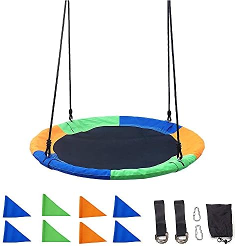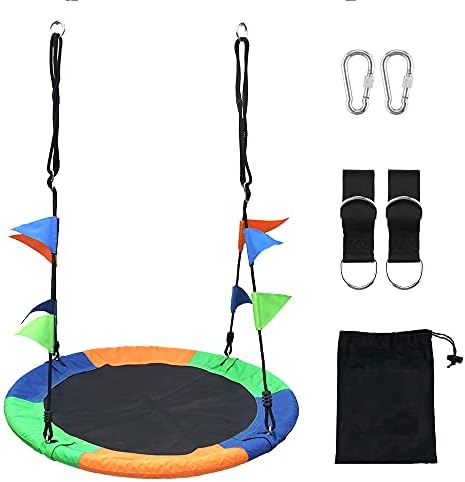More Fun: The tree swing can be multiple used, sitting,reading and sleeping, it will supply so much fun! Outdoor Fun – Set up this reimagined tree swing and watch your kids have so much fun you will want to join them. Large 40-inch diameter size ensures enough room for everyone, and can easily support up to 500 lbs. Weather Resistant: Our saucer swings are known to take a beating from the weather and continue looking great. Our unique 900D Oxford fabric means that rain and snow are no match for this swing. We also use commercial grade rope so you don’t have to worry about repairs. We built this swing to handle anything Mother Nature throws its way. Simple Install: What good is a swing if it’s complicated to put together and take apart? We designed our swing with simplicity in mind. Our easy to follow instructions make it a breeze to put together or take apart for winter storage. Hang it from a large tree branch or attach it to a swing set. Perfect After Sales Service:We offer a 100% money back guarantee.Customer’s satisfaction is always our priority. Package List: 1 x Tree Swing Seat 2 x Hanging Straps 2 x Adjustable Ropes 2 x Carabiners 8 x flag 1 x Install Tools Kit 1 x Instruction.